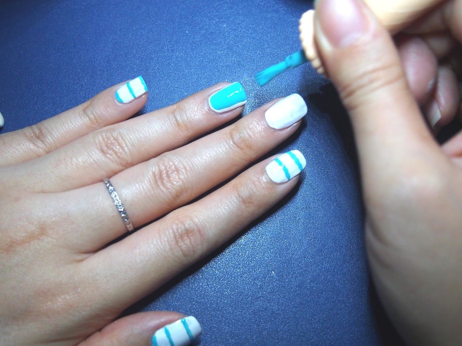 (please excuse me for my clumsiness, i actually forgot to layered turquoise polish on my Ring and Middle finger. so i'm just gonna do it in the midst of the process, but do remember to leave some space for the white polish to create a clean border effect. you guys can do this layering before or after completed drawing the strips)